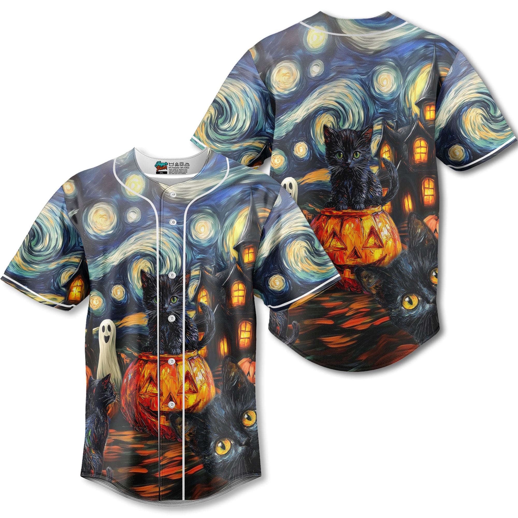 Black Cat Halloween Style Van Gogh Baseball Jersey - HYPERFAVOR