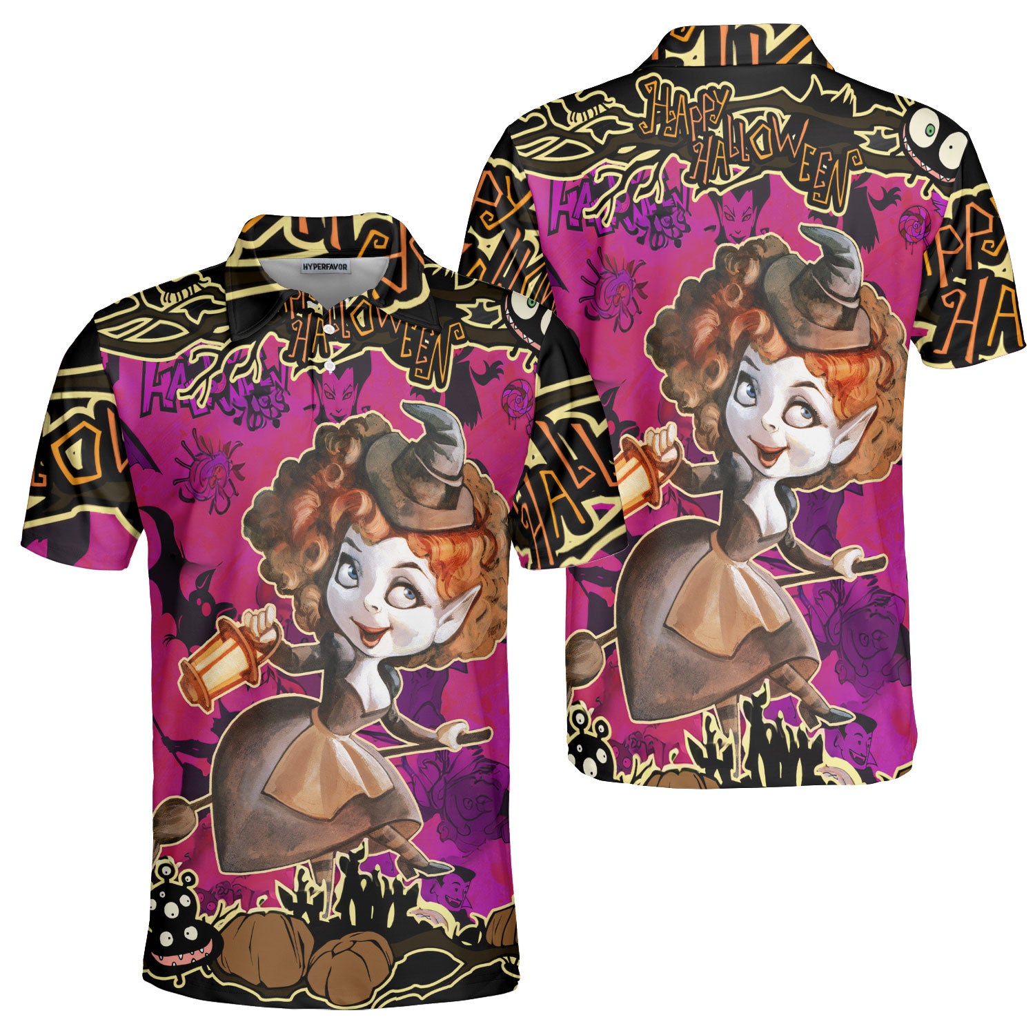 Cartoon Halloween Illustration Witch Purple Polo Shirt - HYPERFAVOR