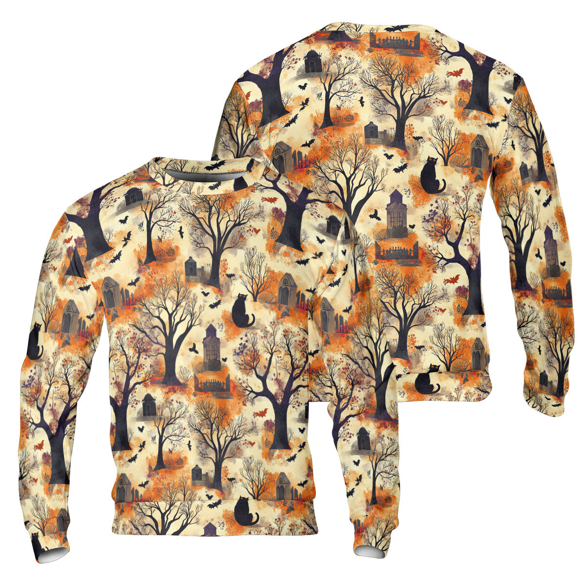 Cat And Graveyard Halloween Pattern Sweatshirt - HYPERFAVOR