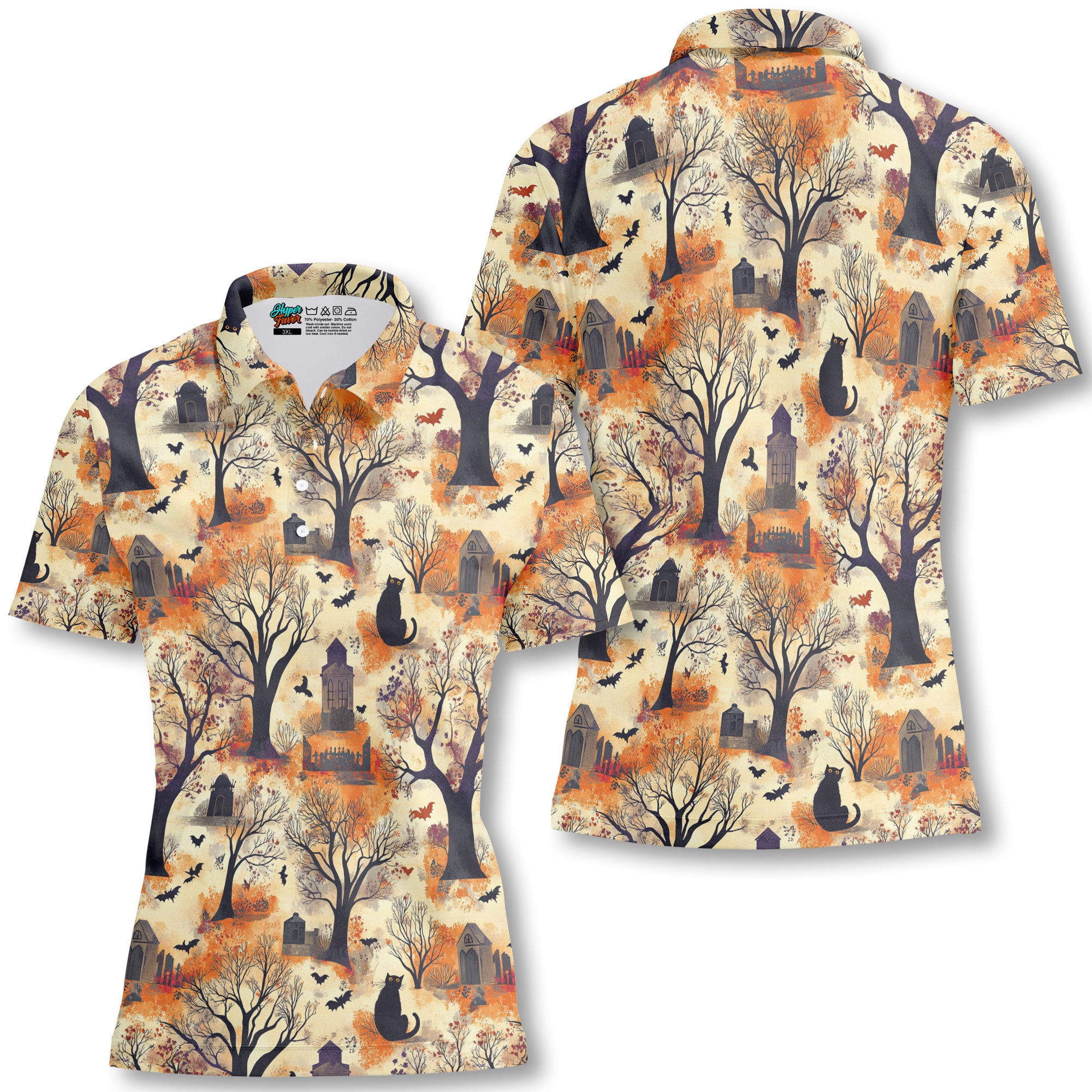 Cat And Graveyard Halloween Pattern Woman Polo Shirt - HYPERFAVOR