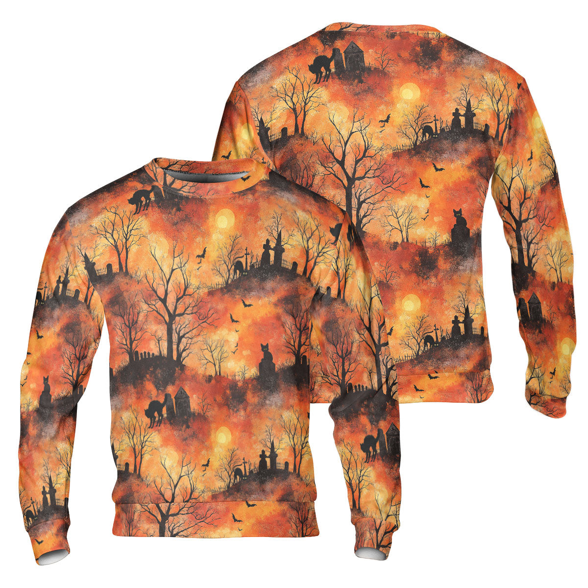 Cat Graveyard Orange Halloween Pattern Sweatshirt - HYPERFAVOR