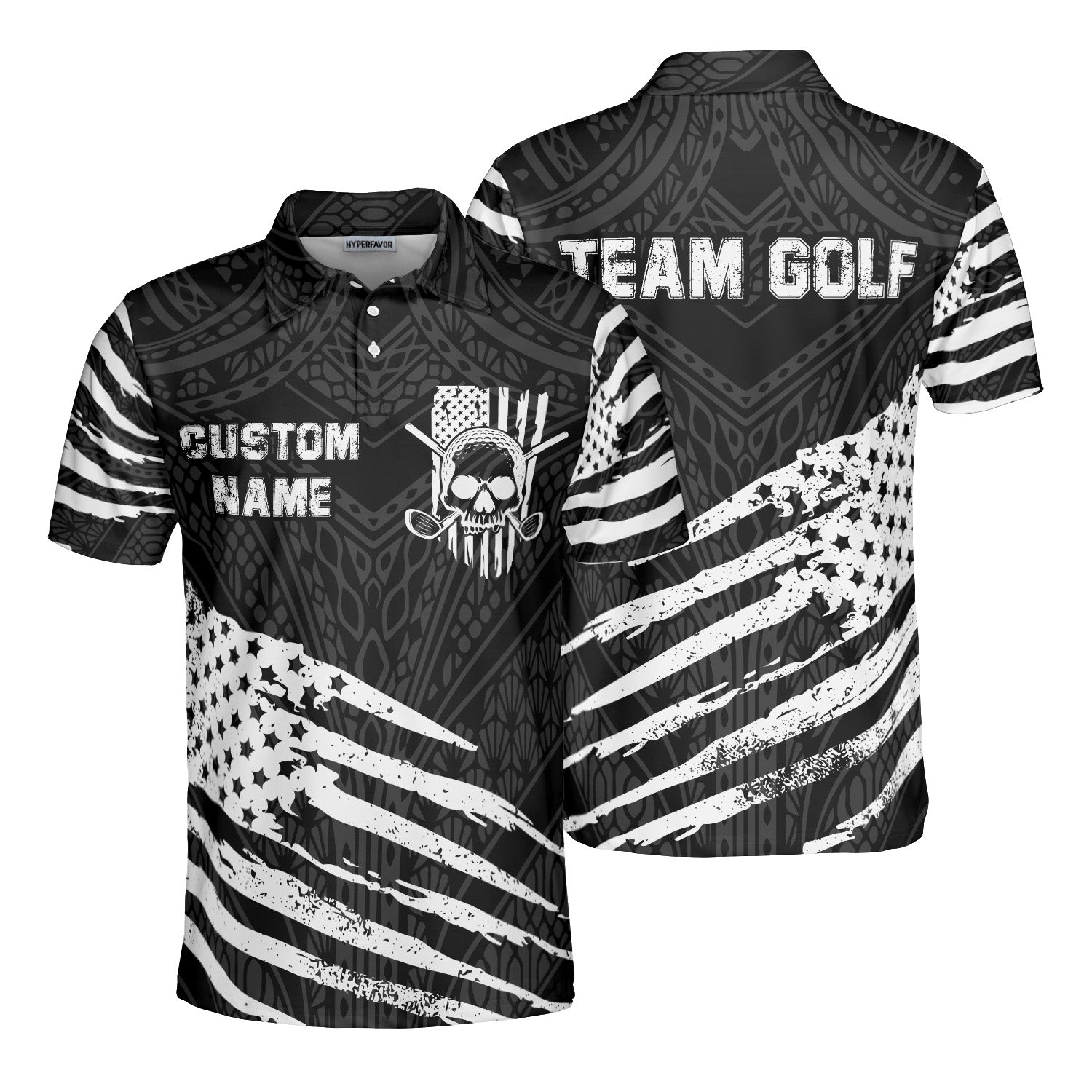 HYPERFAVOR Personalized Black And White Tribal Skull US Flag Golf Polo Shirt
