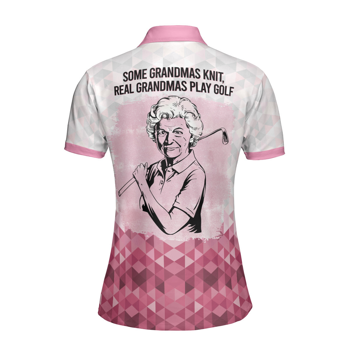 Who says grandmas only knit? Real grandmas bring the heat to the golf course. This personalized polo shirt features playful artwork and a bold message: “Some Grandmas Knit, Real Grandmas Play Golf.” Made with breathable fabric in soft white and pink tones, it’s perfect for ladies who love golf and have a great sense of humor. Add your name to the front for a custom touch and swing in style. Whether it's for yourself or a gift for your favorite golf-loving grandma, this shirt is tee-rific!