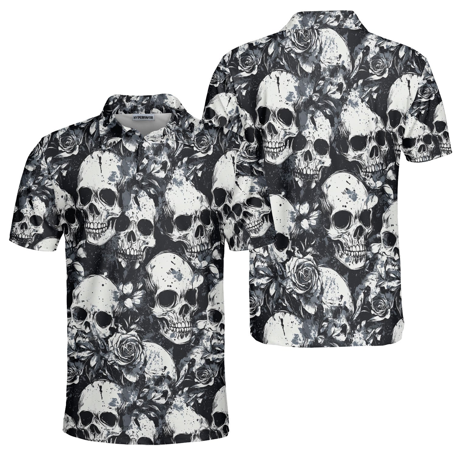 Rose Flower Skull Black & White Pattern Men Polo Shirt - HYPERFAVOR
