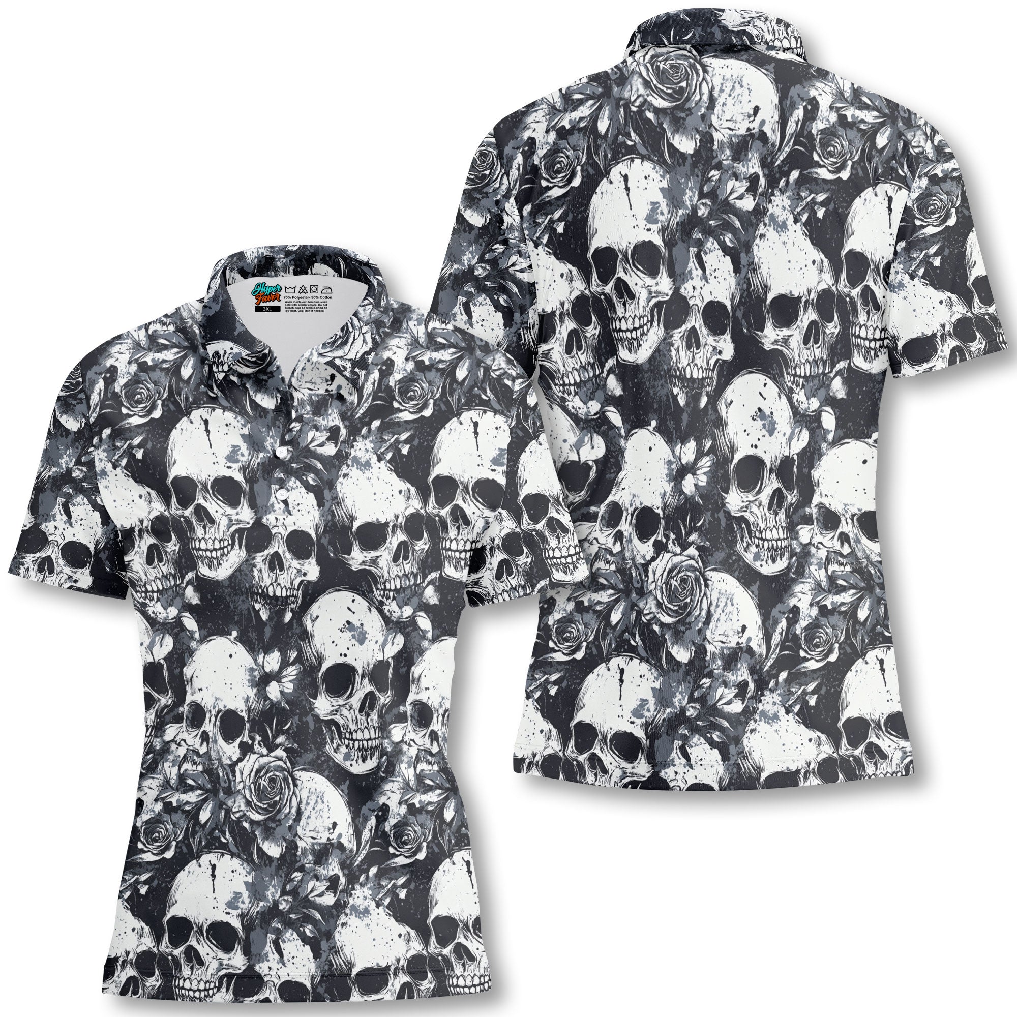 Rose Flower Skull Black & White Pattern Women Polo Shirt - HYPERFAVOR