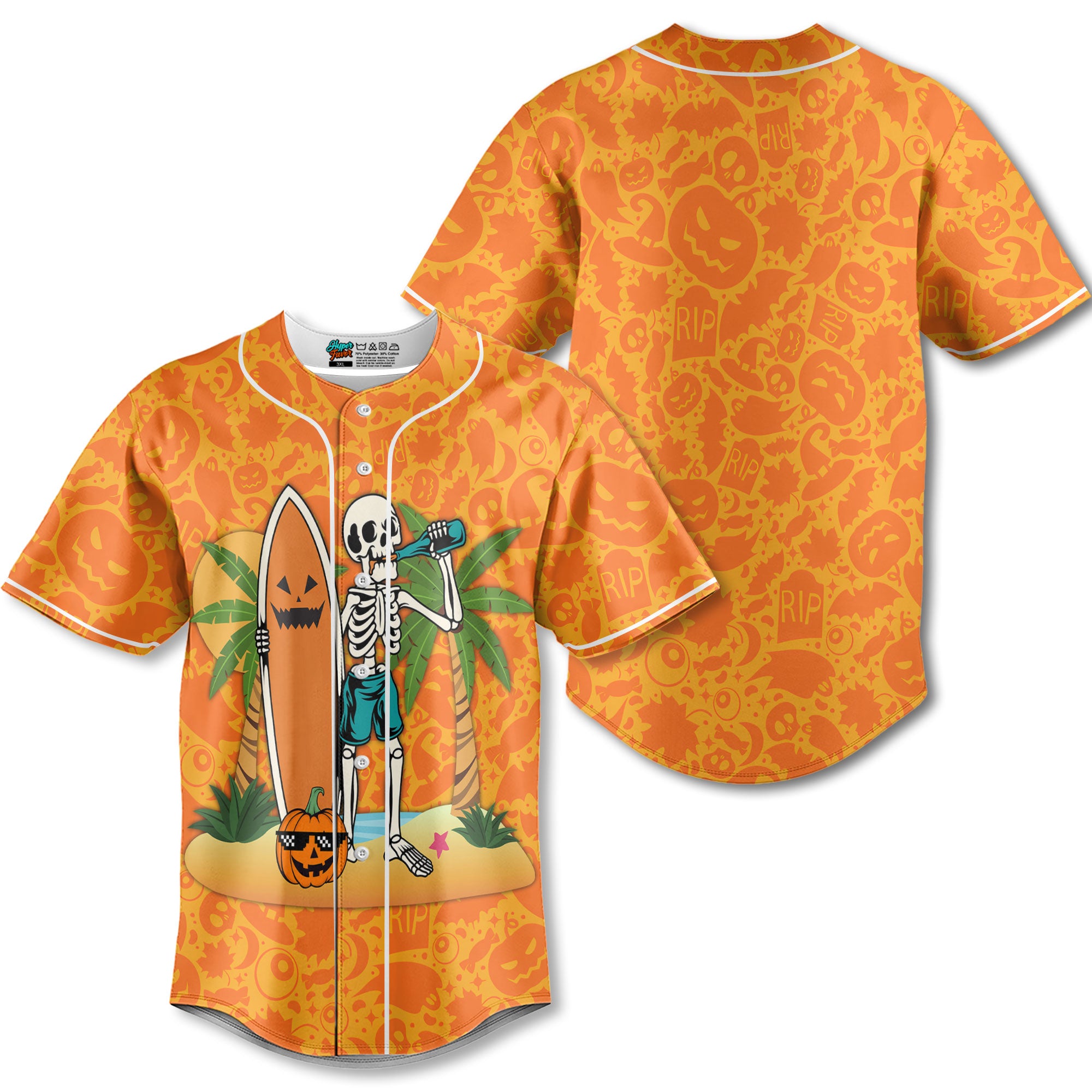 Skeleton Surfing Orange Halloween Ghost Pumpkins Baseball Jersey - HYPERFAVOR