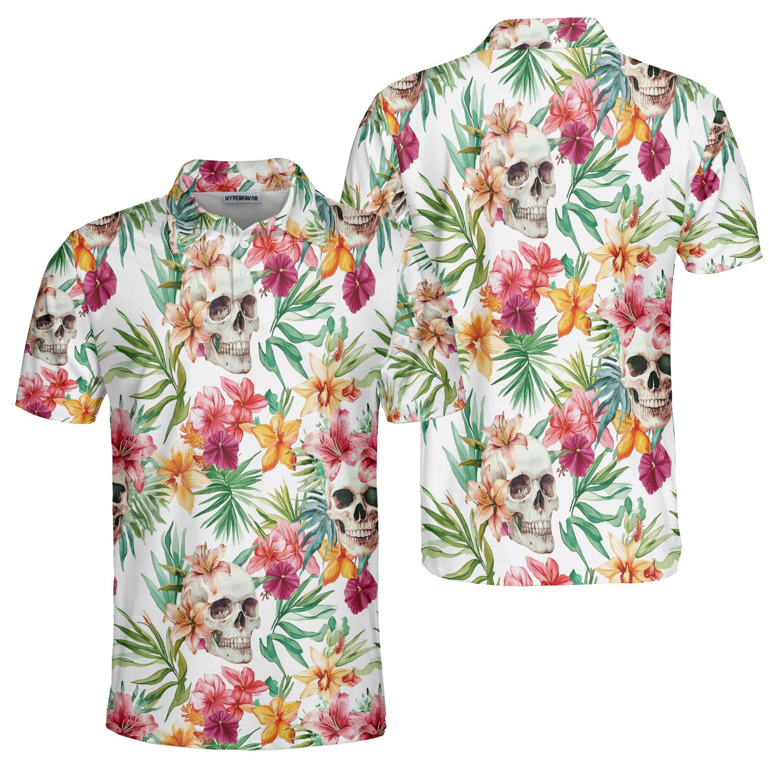 Tropical Flower Skull Pattern Men Polo Shirt - HYPERFAVOR